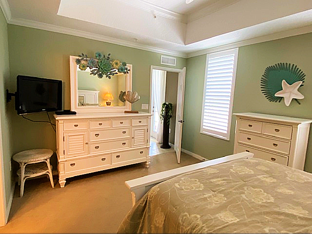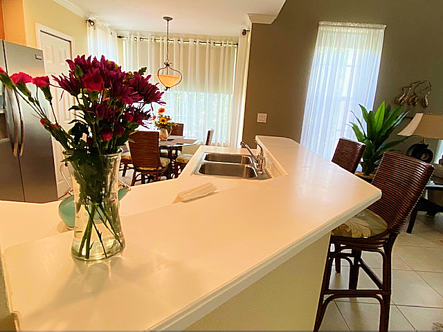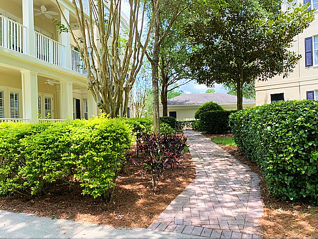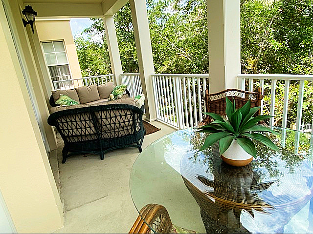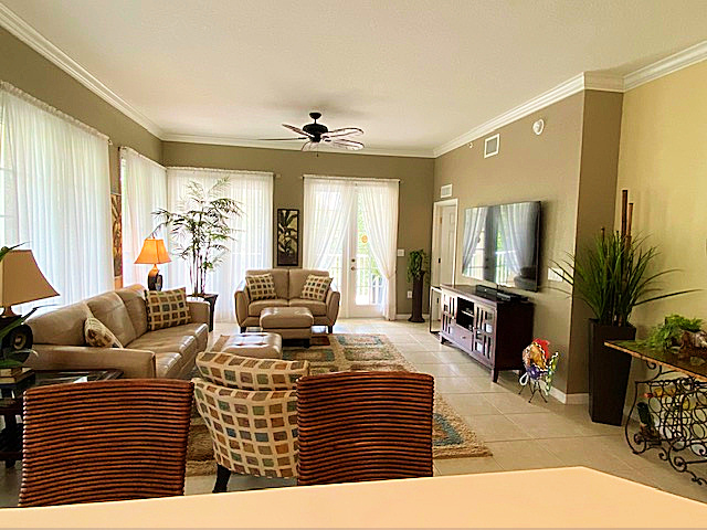 Privacy abounds in this rare 3rd floor end unit condo with a wrap-around balcony. Tranquil atmosphere, comfortable rooms, and light-blocking blinds. Stainless steel appliances, ample cabinets, and a lovely dining area surrounded by windows. The great room features French doors leading to the balcony. Master Bedroom with tray ceiling, fan, and spacious closet. Updated A/C and water heater. New carpet in bedrooms, crown moldings throughout. Elevator access. 1-car garage + extra parking. Live the Celebration Dream!